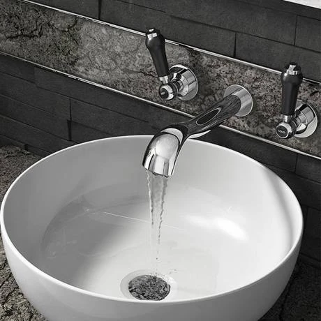 The Albert Traditional Basin Mixer Tap with Black Lever Handles. Sleek yet classic curved design finished. This Victorian-inspired Wall Mounted Tap is a bathroom essential for any bathroom.