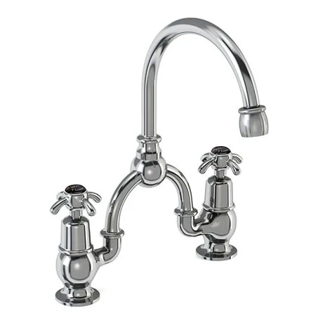 The Burlington Anglesey Black Bridge Curved Spout Basin Mixer is the perfect complement to Burlington’s Jet Black range. This basin mixer is constructed from brass and beautifully finished in chrome. It features traditional screw down valves and a swivel spout with a 180° swivel range.