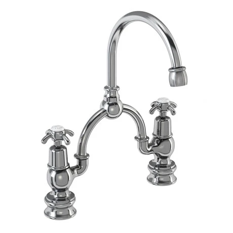 The Burlington Anglesey Regent 2 Tap Hole Bridge Curved Spout Basin Mixer (230mm centers) with Invisible Overflow, create the perfect period bathroom with our range of quality chrome plated traditional taps. Comes with a 10 year guarantee. All Anglesey taps have a four spindle tap head with a ceramic indice in the centre.