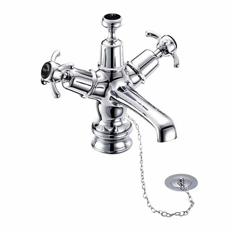 The Burlington Anglesey Regent Black Basin Mixer is the perfect complement to Burlingtons Jet Black range. This basin mixer is constructed from brass and beautifully finished in chrome. The Regent base gives the tap a ridged, slightly taller, elegant appearance. It features traditional screw down valves and comes supplied with a plug and chain waste.