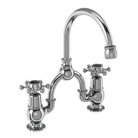 The Burlington Birkenhead Black Bridge Curved Spout Basin Mixer is the perfect complement to Burlington’s Jet Black range. This basin mixer is constructed from brass and beautifully finished in chrome. It features traditional screw down valves and a swivel spout with a 180° swivel range.