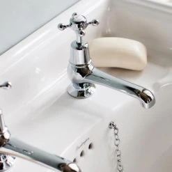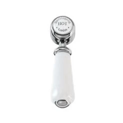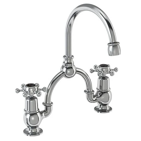 The Burlington Birkenhead Black Bridge Curved Spout Basin Mixer is the perfect complement to Burlington’s Jet Black range. This basin mixer is constructed from brass and beautifully finished in chrome. It features traditional screw down valves and a swivel spout with a 180° swivel range.