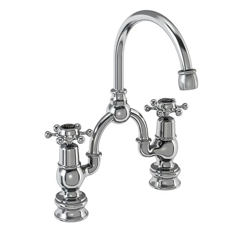 The Burlington Birkenhead Regent Black Bridge Curved Spout Basin Mixer is the perfect complement to Burlington’s Jet Black range. The Regent base gives the tap a ridged, slightly taller, elegant appearance. It features traditional screw down valves and a swivel spout with a 180° swivel range.