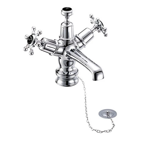 The Burlington Birkenhead Regent Black Basin Mixer is the perfect complement to Burlingtons Jet Black range. This basin mixer is constructed from brass and beautifully finished in chrome. The Regent base gives the tap a ridged, slightly taller, elegant appearance. It features traditional screw down valves and comes supplied with a plug and chain waste.