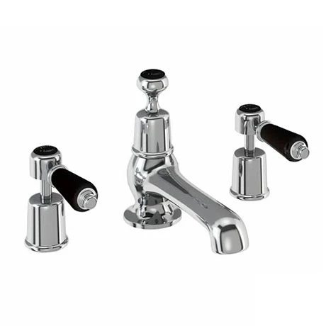 The Burlington Kensington black 3 tap hole basin mixer is the perfect complement to Burlington’s Jet Black range. This basin mixer is constructed from brass and beautifully finished in chrome. It features quarter-turn valves and comes supplied with a pop-up waste.