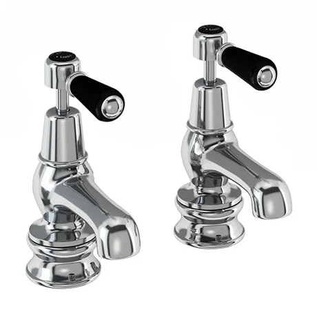 The Burlington Birkenhead tap range with black ceramic indices is the perfect complement to Burlington’s Jet Black range. These basin taps are constructed from brass and beautifully finished in chrome. The Regent base gives the tap a ridged, slightly taller, elegant appearance. It features quarter-turn valves and come supplied as a pair.