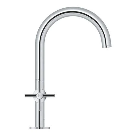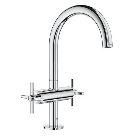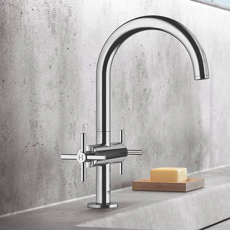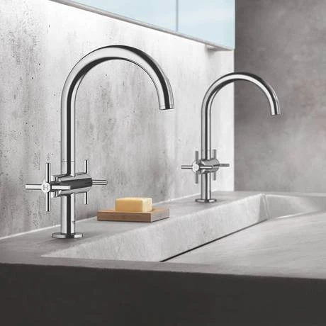 The Grohe Atrio basin mixer is a premium, high performance tap ideal for those wanting to make a style stamement. It features a twin crosshead handle design offering precise control and a high C-spout that swivels 150° for extra user comfort. Crafted from high quality materials and finished in GROHE StarLight chrome coating that is scratch resistant and easy to clean. Comes supplied with a click clack waste which simply opens and closes with an effortless push.