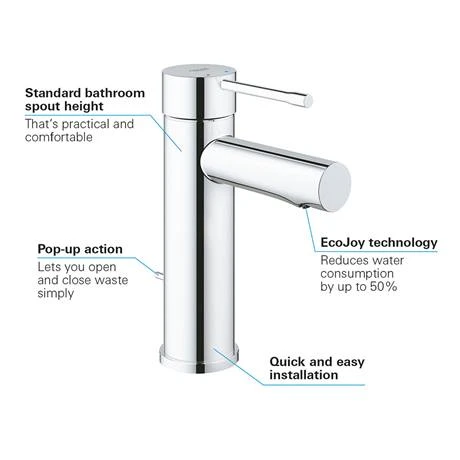 The Essence mono basin mixer features a modern design with state-of-the-art features and comes supplied with an integrated pop-up waste for ease of use. GROHE SilkMove® technology ensures effortless lever operation while the GROHE EcoJoy® system is a unique water saving function that can reduce consumption by up to 50%. Crafted from high quality materials and finished in a special chrome coating that is scratch resistant and easy to clean.