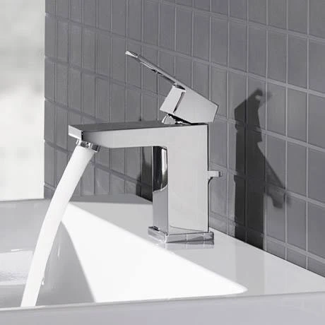 This Grohe Eurocube bathroom tap adds a unique and distinctive touch to your bathroom. Engineered with the GROHE SilkMove technology, the operating lever moves super smoothly, allowing you to control water temperature and volume with ease. Thanks to the patented GROHE EcoJoy technology, the tap provides a powerful flow while limiting your water consumption to 5.7 litres per minute. Finished in dazzling and scratch resistant GROHE StarLight chrome, it has a sparkle that will last for many years. Comes supplied with a pop-up waste for easy operation.