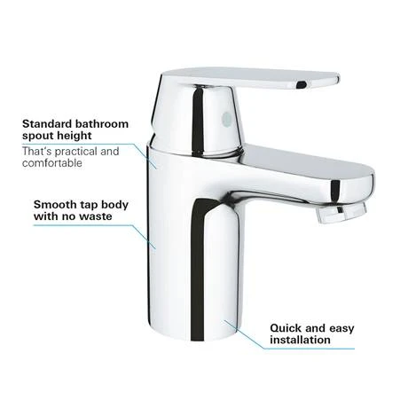 The Eurosmart Cosmopolitan Mono Basin Mixer features a modern design with state-of-the-art features and a smooth body for basins that do not require a pop-up waste or retractable chain. Water temperature and volume are very easy to adjust thanks to GROHE SilkMove® technology. Crafted from high quality materials and finished GROHE StarLight® chrome coating that is scratch resistant and easy to clean. All Grohe bathroom taps come with a 5 year guarantee.