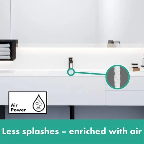 The geometric Vernis Shape variant, with its precise edges, stands for a visually striking look. This single lever basin mixer offers an economical way of adding designer elegance to your bathroom. AirPower technology adds generous amounts of air to the water, creating a soft, splash-free spray while EcoSmart technology reduces the flow rate to save water and energy.