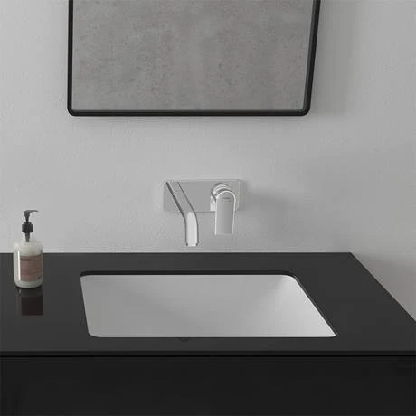 The geometric Vernis Shape variant, with its precise edges, stands for a visually striking look. This wall mounted single lever basin mixer is made from high quality materials and finished in chrome. The handle can be positioned on the right or left, depending on the basic set installation. AirPower technology adds generous amounts of air to the water, creating a soft, splash-free spray while EcoSmart technology reduces the flow rate to save water and energy.